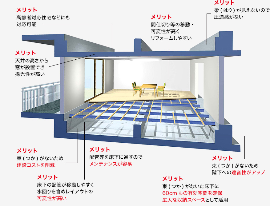 逆梁によって生まれた深さ60cmの広大な床下空間により、上下階の遮音性が向上しました。床下への遮音性能は、高級分…