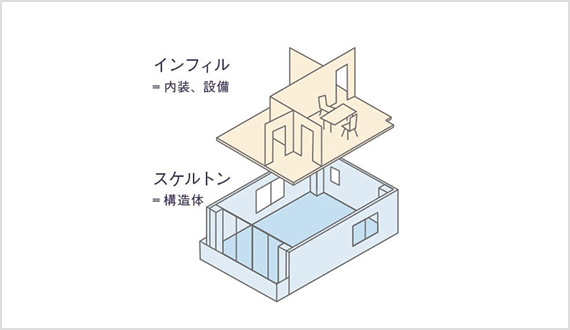 建物をスケルトン(= 構造体)とインフィル(= 住戸部分)に分けることを言います。耐用年数の短いインフィルのみを定期的に改修することにより、建物を長持ちさせるための構造です。必要な箇所のみ改修できるのでコスト(維持管理費)の軽減にもなり、将来にわたって資産管理を維持させるために必要不可欠な構造です。