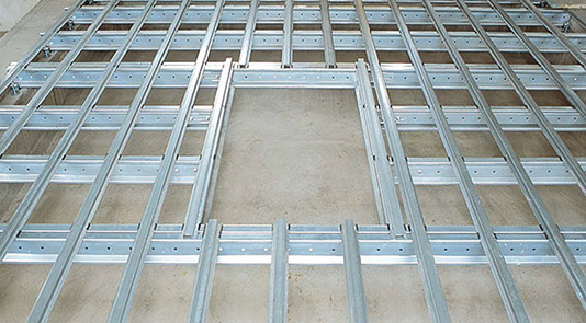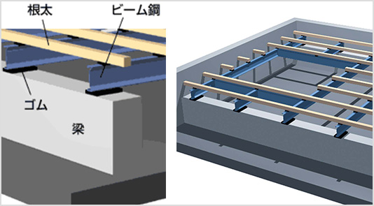 ルネス工法では、束のない床下を実現するために、梁の間に床仕上材を載せるのに建築用鋼材ではなく、自動車の車台に使われる非常に強い材料である軽量ビーム鋼を使用しています。