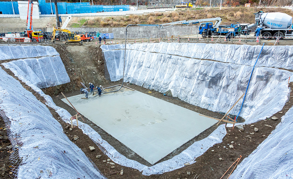 2号橋A1橋台の基礎工事。直接基礎となる為、岩盤掘削完了後に均しコンクリートを打設。 -