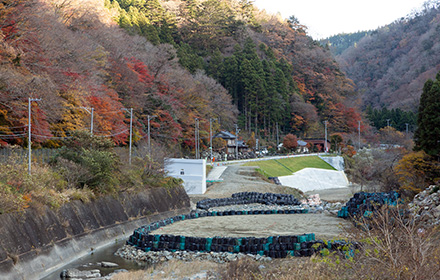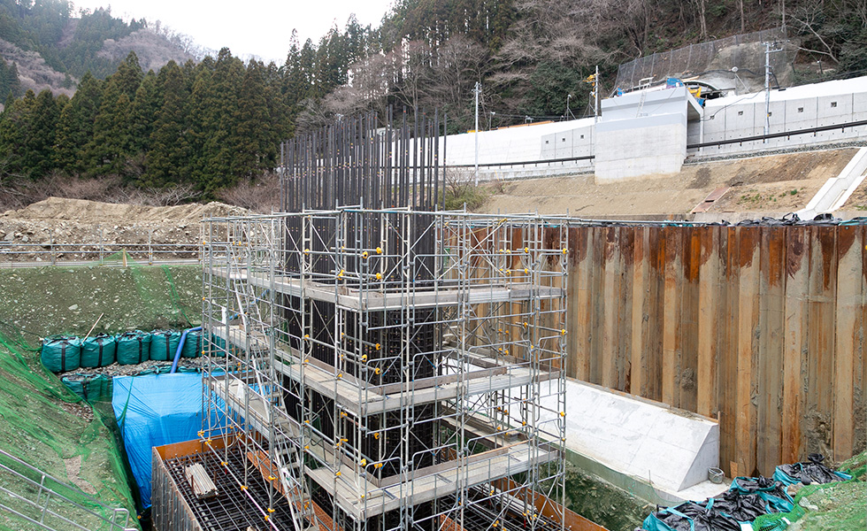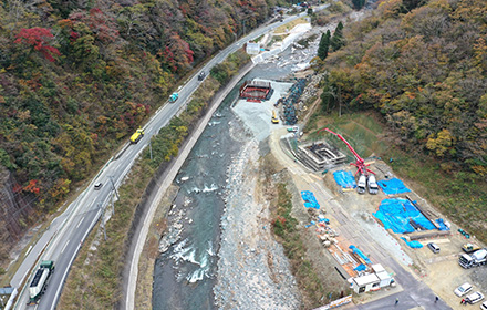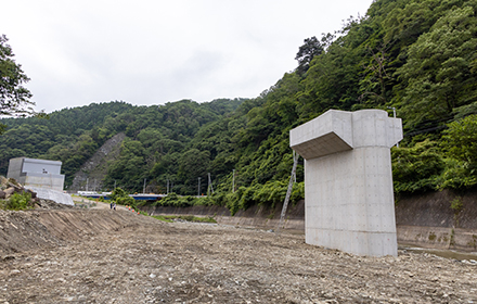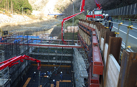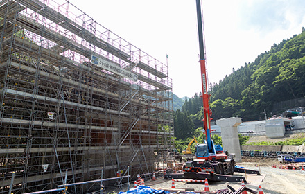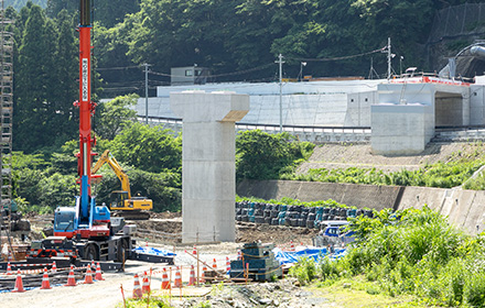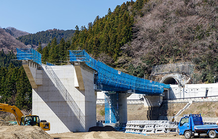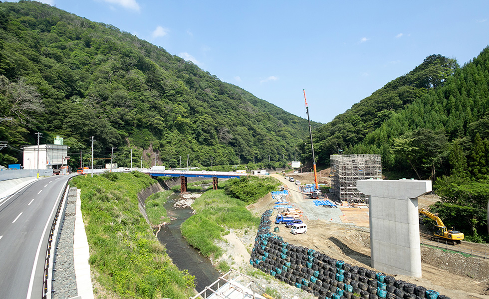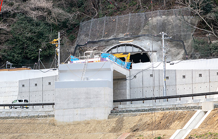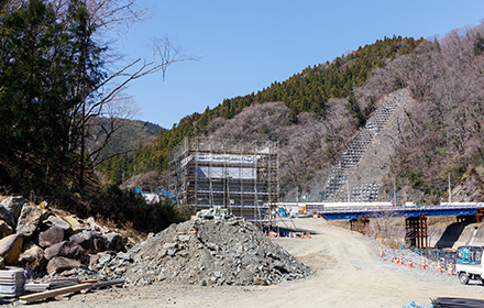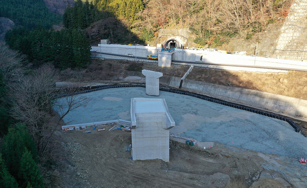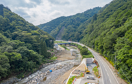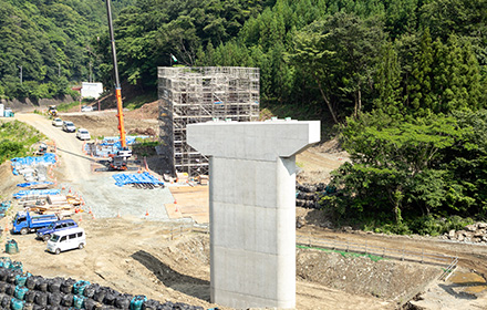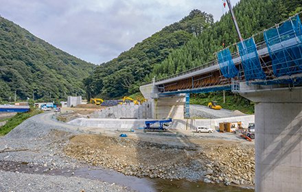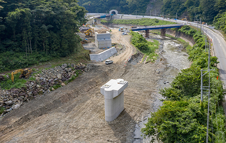 今後は上部工、護岸工、舗装工と進み供用開始となります。この道路が完成することにより、大雨時の通行止め並びに地すべり等の危険性が解消され、物流路線や緊急輸送路としての信頼性の高い道路になると思います。