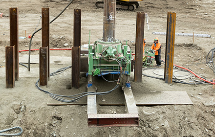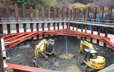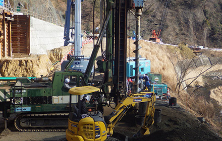 当現場では、山留工におけるH鋼設置、仮桟橋工、場所打杭工の先行掘削とすべての工種で使用しています。
