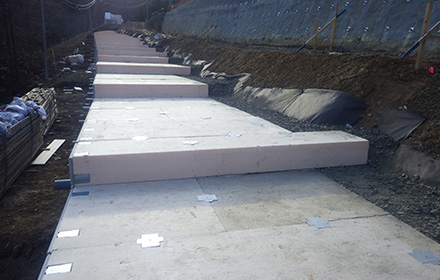 2号取付道路工 軽量盛土工(発泡材にて車道下に盛土を行なう)。