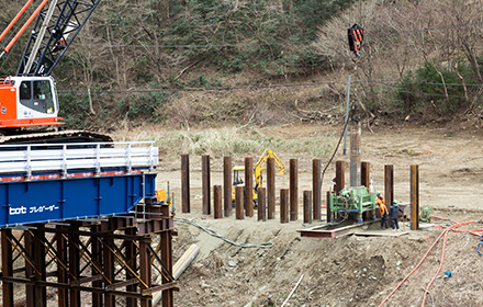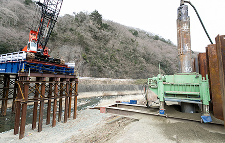 120tクローラークレーンにて対岸の支持杭を施工。 -