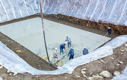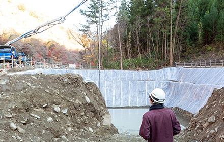 コンクリート打設状況を監視する職員。
