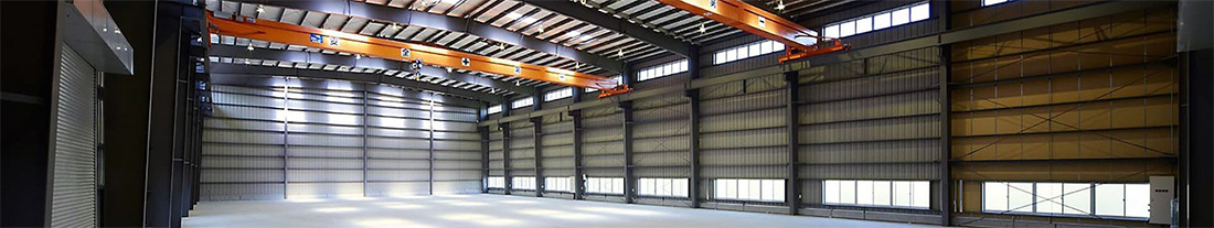 桁行長さは途中(120m毎)にエキスパンションジョイントを設ければ制限はありません。最高高さは20m(標準は12m以下)、搭載クレーン容量は30トンまで可能です。これらの寸法を超える場合にもお気軽にご相談下さい。