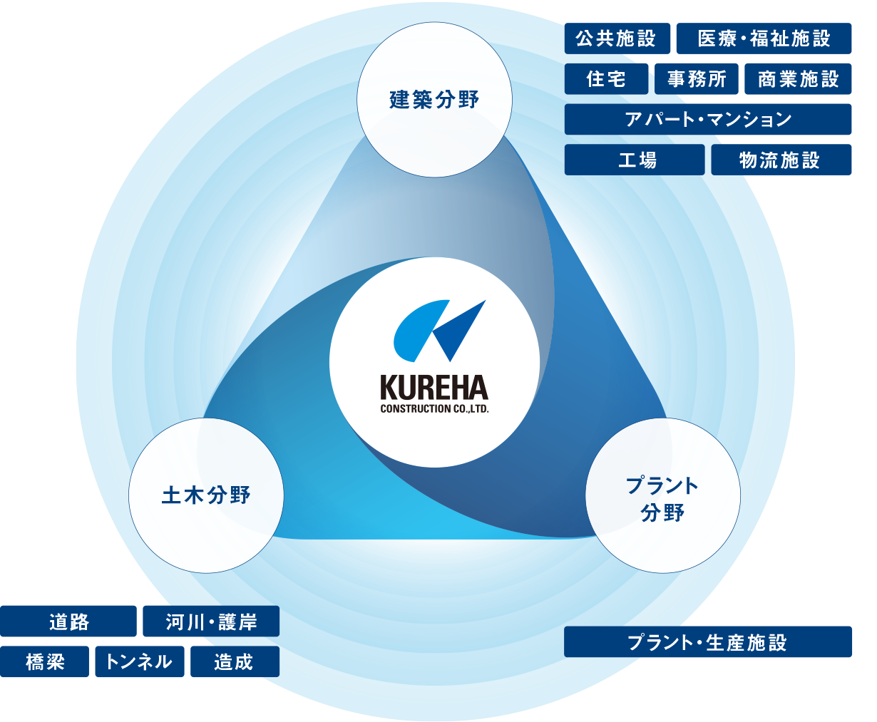 公共施設や医療・福祉施設、商業ビル、工場、事務所、様々な新築工事はもちろん、耐震、免震、リノベーションなどの改修工事まで、高度化・多様化するニーズに合わせた建築物を確かな品質で築きます。